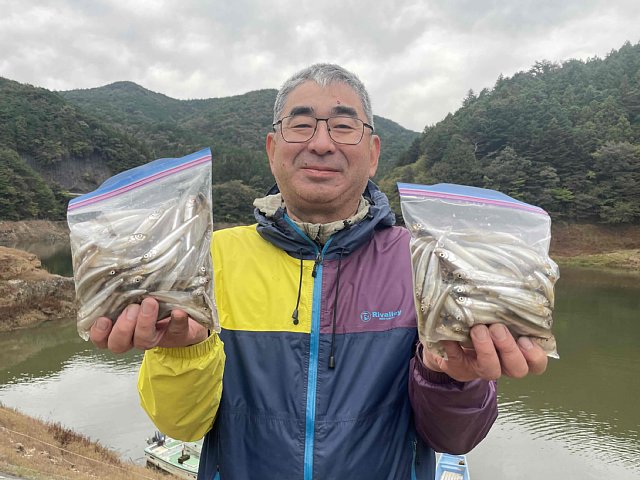 10月22日(水) 本日はかなり冷え込む一日となりましたがワカサギ200匹の好釣果です。 水深あるダムサイト付近の中層で楽しんでいただけた様です。 天候によっては今日の様に急に冷え込む日もございます。 寒さ対策万全に皆様のご来場お待ちしております。